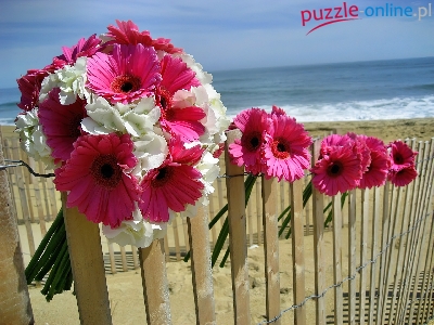 Puzzle Plaża, Różowe, Gerbery, Morze
