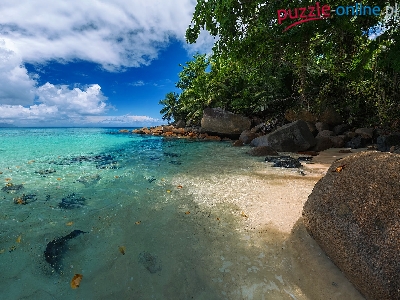 Plaża, Palmy, Seszele, Wyspa Mahe, Kamienie