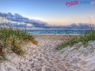 Puzzle Plaża, Chmury, Morze, Trawa