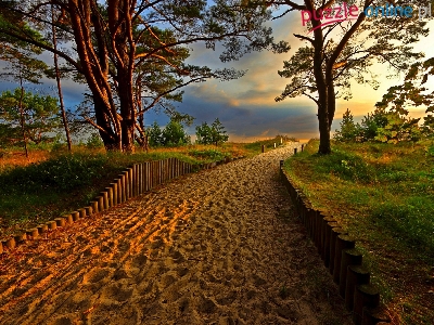 Plaża, Ścieżka, Wschód Słońca, Morze, Drzewa