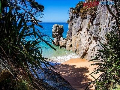 Puzzle Plaża, Morze, Skały, Zieleń