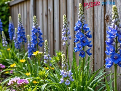 Puzzle Ostróżka, Kwiaty, Niebieska, Płot