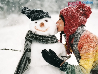 Pocałunek, Śnieg, Bałwanek, Dziewczyna, Zima
