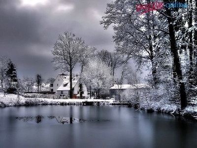 Pochmurne, Domek, Zamarznięte, Jezioro, Niebo