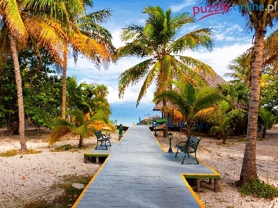 Podest, Tropiki, Plaża, Palmy, Ławki