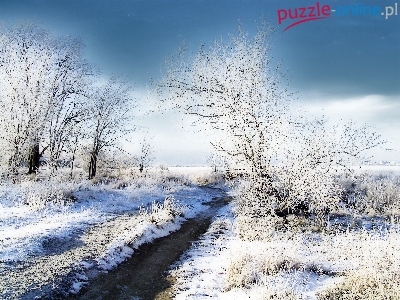 Pokryte, Rzeczka, Drzewa, Łąka, Śniegiem