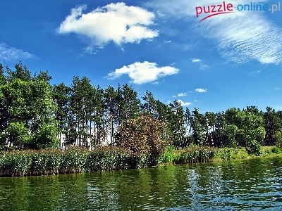 Pokrzywy, Drzewa, Chmury, Jezioro, Trawy, Niebo
