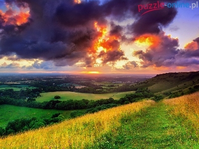 Pola, Ścieżka, Panorama, Góra, Łąki, Chmury