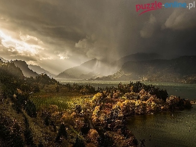 Pola, Jesień, Mgła, Góry, Lasy, Jezioro