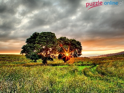 Pola, Zachód Słońca, Zachmurzone, Niebo, Drzewa