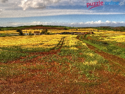 Łąki, Rzepak, Farmy, Pola, Droga