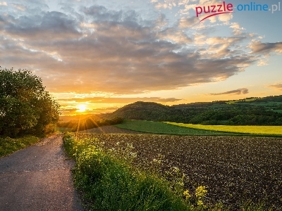 Nadrenia Palatynat, Drzewa, Zachód słońca, Droga, Niemcy, Góry Eifel, Pola