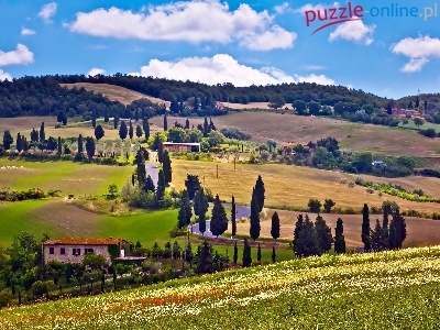 Toskanii, Pola, Domy, Lasy, Krajobraz, Wzgórza, Łąki