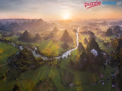 Prowincja Cao Bang, Wietnam, Mgła, Rzeka, Pola, Wschód słońca, Kręta, Góry