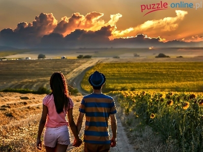 Pola, Słoneczniki, Para, Droga, Zachód Słońca