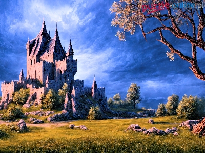 Chmury, Drzewa, Zamek, Polana, Paintography, Niebo