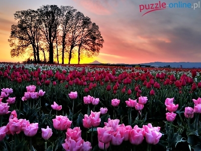 Pole, Słońca, Tulipanów, Zachód, Drzewa, Kolorowych