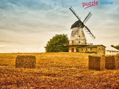 Pole, Słoma, Wiatrak, Drzewa, Budynki