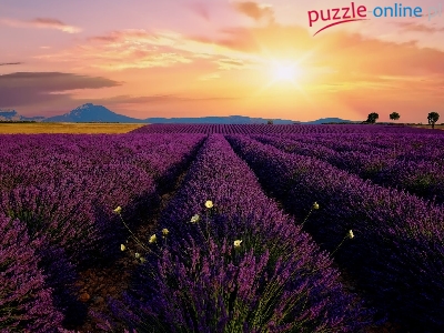 Wschód słońca, Lawenda, Pole, Drzewa, Góry