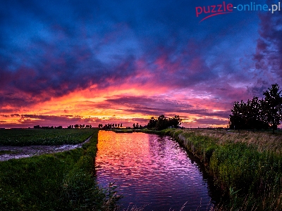 Pole, Drzewa, Rzeka, Zachód słońca, Niebo