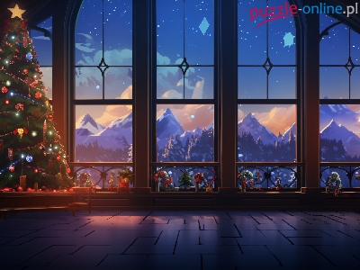 Półki, Okno, Pokój, Drzewa, Książki, Boże Narodzenie, Grafika, Góry, Lampy