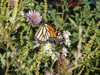 Puzzle Polne, Motyl, Monarch, Kwiaty