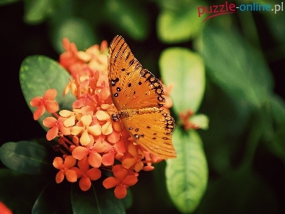 Puzzle Pomarańczowe, Piękny, Motyl, Kwiatuszki