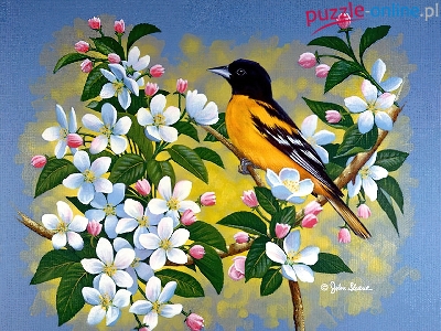 Pomarańczowo, Białe, Ptak, Gałązka, Kwiatki, Czarny