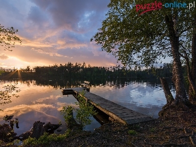 Drzewa, Pomost, Chmury, Jezioro, Ławka, Zachód słońca
