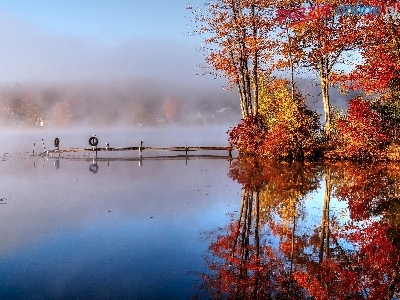 Pomost, Drzewa, Jesień, Jezioro, Mgła