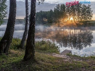 Brzozy, Wschód słońca, Drzewa, Trawa, Mgła, Rzeka, Pomost