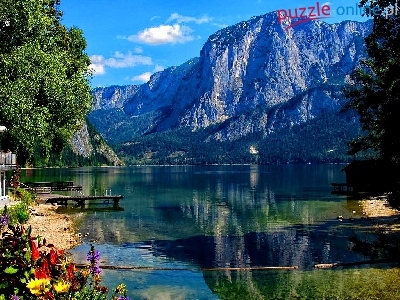 Puzzle Pomosty, Góry, Jezioro, Kwiaty
