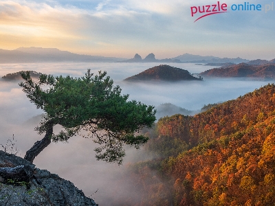 Sosna, Jesień, Drzewo, Wschód słońca, Mgła, Góry, Poranek