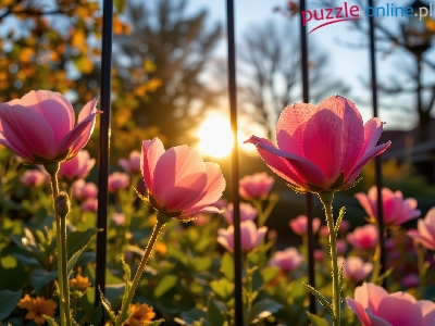 Puzzle Ogrodzenie, Różowe, Kwiaty, Poranek