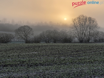 Pole, Mgła, Drzewa, Poranek, Wschód słońca