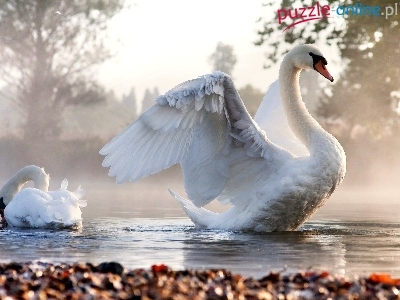 Puzzle Poranek, Łabędzie, Woda, Mgła