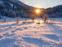 Poranek, Grafika AI, Wschód słońca, Pole, Drzewa, Góry, Zima, Las