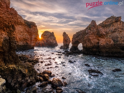 Ponta da Piedade, Wybrzeże, Wschód słońca, Portugalia, Morze, Skały, Region Algarve