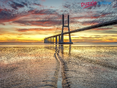 Vasco da Gama, Rzeka Tag, Most, Portugalia, Zachód słońca, Chmury, Lizbona