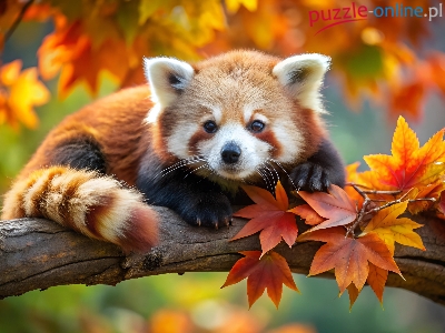 Liście, Konar, Jesień, Pandka ruda, Grafika AI, Pożółkłe