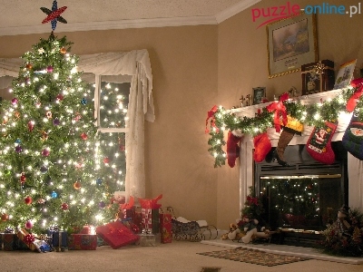 Prezenty, Lampki, Choinka, Kominek, Skarpety