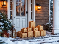 Prezenty, Dom, Zima, Drzwi, Ośnieżone, Choinka, Boże Narodzenie, Lampiony, Schody