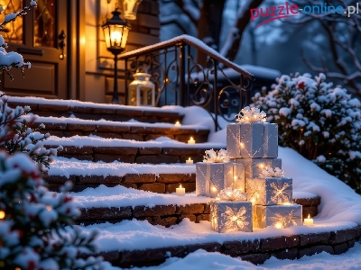 Prezenty, Dom, Zima, Schody, Ośnieżone, Świece, Latarnia, Śnieg, Krzewy