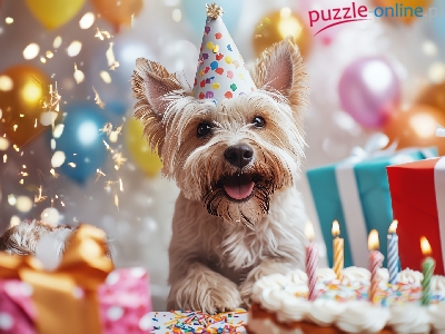 Prezenty, Urodziny, Åšwieczki, Yorkshire terrier, Czapeczka, Tort, Pies, Balony