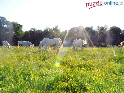Puzzle Promienie, Konie, Łąka, Słońca