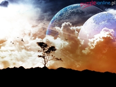 Puzzle Promienie, Drzewo, Chmury, Planety