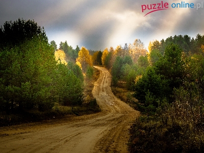 Promienie, Las, Jesień, Droga, Chmury, Słońca