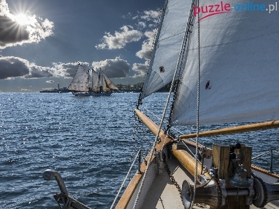 Promienie, Żaglówki, Jezioro, Chmury, Słońca