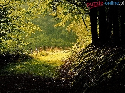 Puzzle Promienie, Jesień, Las, Ścieżka, Słońca