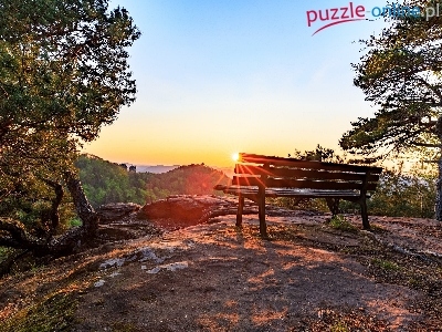 Puzzle Promienie słońca, Ławka, Drzewa, Wzgórza